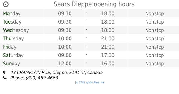 It is also possible to : Edit these OPENING HOURS of Store Sears In Dieppe, 43 CHAMPLAIN RUE,
